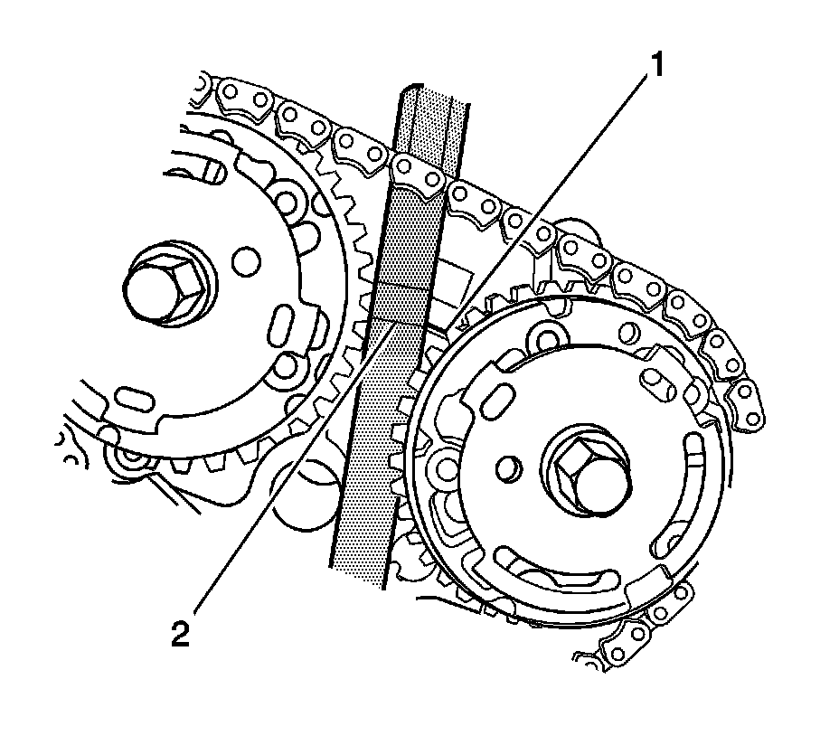 9. Insert the EN-48313 between the camshaft actuators, rearward of the timing chain until the bottom line that is scribed in the body of the tool (2) is adjacent to the top surface of the cylinder head (1). This is the approximate installed position.