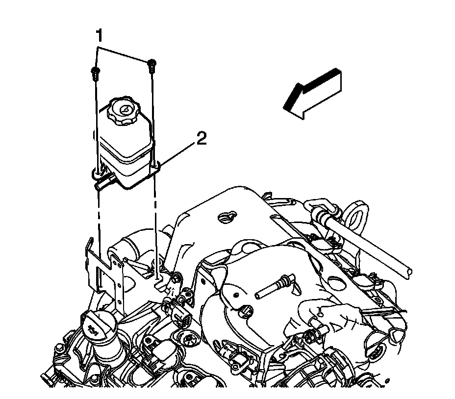 2. Install the remote power steering fluid reservoir bolts (1) and tighten to 9 Nm (80 lb in).