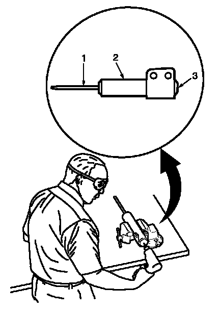 2. Drill a hole in the strut at the center of the end cap (3) using a 5 mm (3/16 in) drill bit. Gas or a gas/oil mixture will exhaust when the drill bit penetrates the strut. Use shop towels in order to contain the escaping oil.