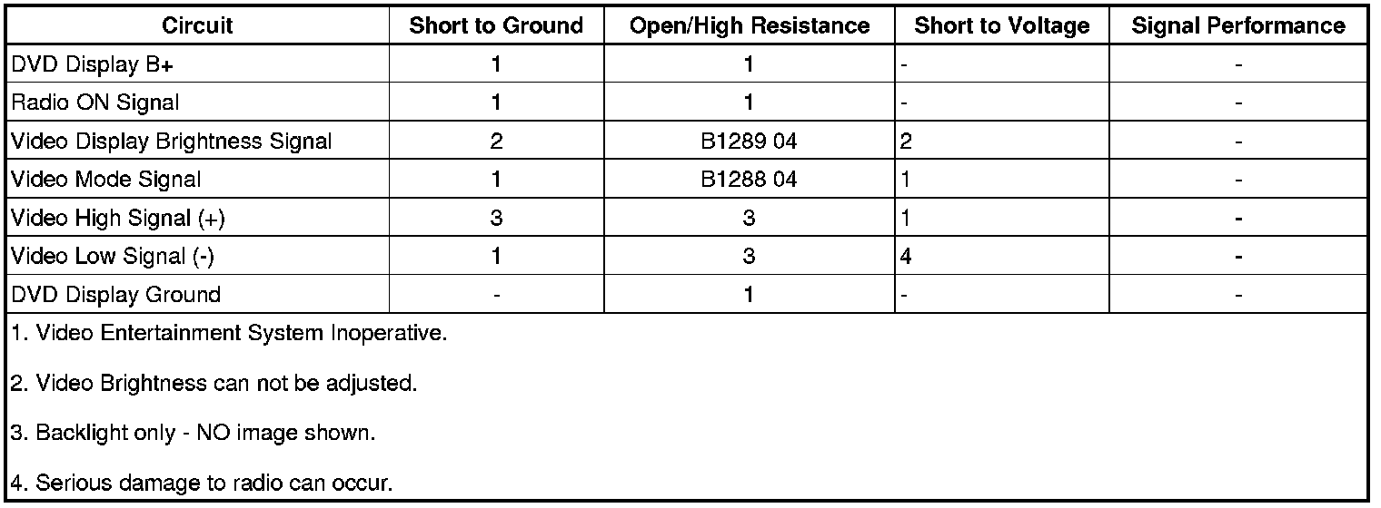 The rear seat entertainment (RSE) system utilizes the vehicle radio to play DVD movies and transmit video signals to the rear digital video disc (DVD) display. When the radio is turned ON, the DVD display receives a voltage signal from the radio via the entertainment remote enable signal circuit indicating the system status. The video high and low signal circuits are used to transmit the DVD images to the rear DVD display. The video high (+) voltage will vary as the brightness and the speed of the image varies. A typical voltage reading for the video high (+) is 1 to 2.5V at the disconnected at the video display.