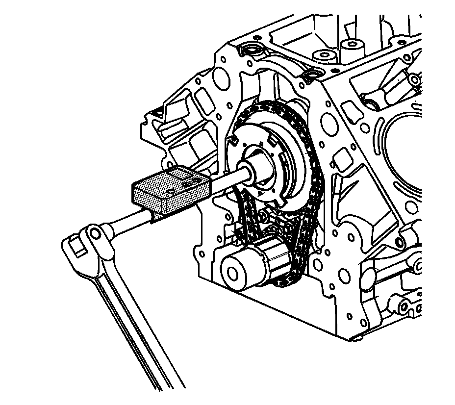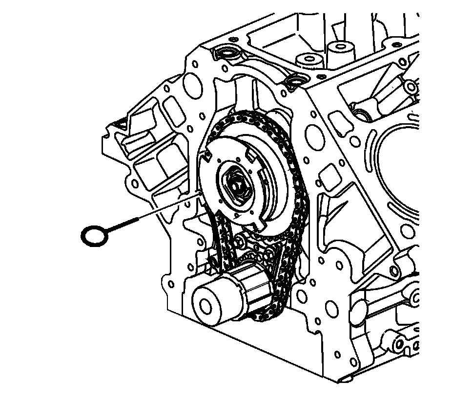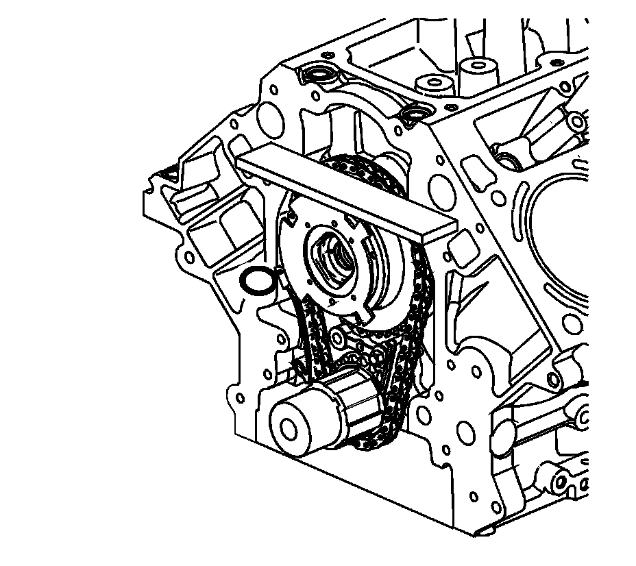 11. Locate a straight edge across the front face of the engine block and inspect for proper installation of the CMP actuator and timing chain. With the CMP actuator properly and completely installed onto the front of camshaft, the timing chain will not protrude beyond the front face of engine block.