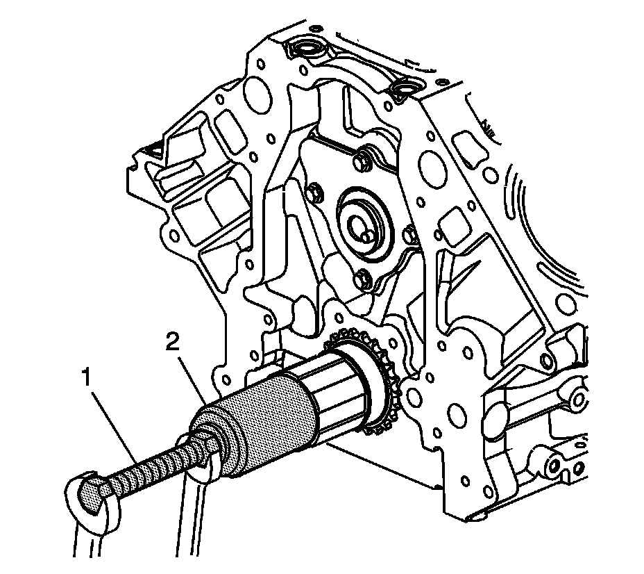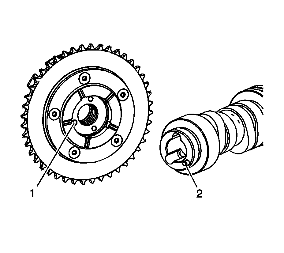 9. Identify the alignment hole (1) in the rear face of the CMP actuator and the locating pin (2) on the front face of the camshaft.