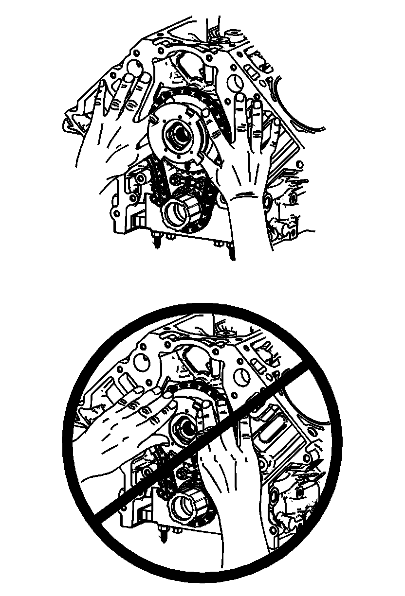 10. Install the CMP actuator and timing chain. Align the hole in the rear face of the CMP actuator with the locating pin on the front face of the camshaft. If necessary, rotate the camshaft or crankshaft sprockets in order to align the timing marks. Use care to install the actuator completely onto the front of the camshaft. Position fingers onto the face of the actuator sprocket and push the actuator onto the front of the camshaft. Never push on the reluctor wheel when attempting to install the actuator.
