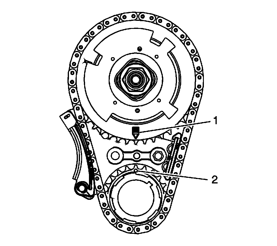 13. Inspect the sprockets for proper alignment. The mark on the CMP actuator sprocket (1) should be located in the 6 o'clock position and the mark on the crankshaft sprocket (2) should be located in the 12 o'clock position.