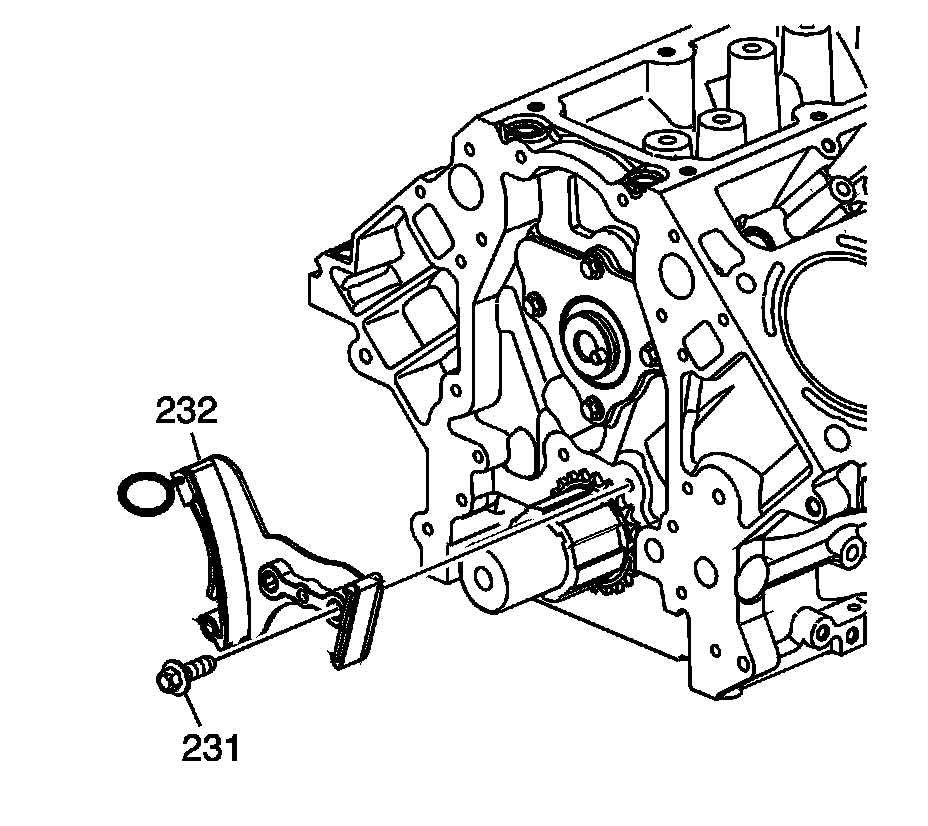 7. Install the timing chain tensioner (232) and left side bolt (231). Do not install the right side bolt at this time. The right side bolt will be installed after the camshaft position (CMP) actuator and chain have been installed onto the engine.