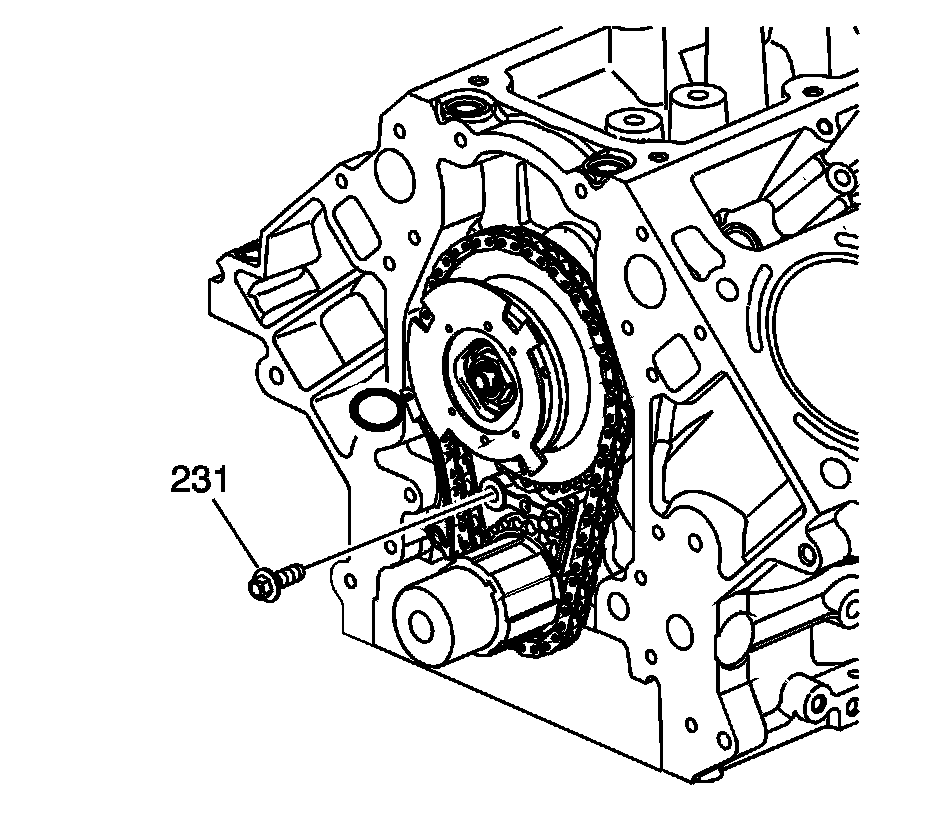 14. Install the right side bolt (231) into the timing chain tensioner and tighten both bolts to 30 Nm (22 lb ft).