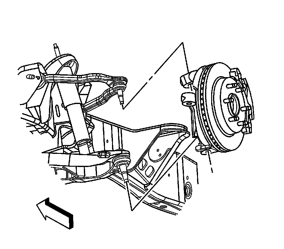 3. Remove the wheel hub and bearing. Refer to Front Wheel Hub, Bearing, and Seal Replacement (4WD) Front Wheel Hub, Bearing, and Seal Replacement (4WD)Front Wheel Hub, Bearing, and Seal Replacement (RWD) Front Wheel Hub, Bearing, and Seal Replacement (RWD).