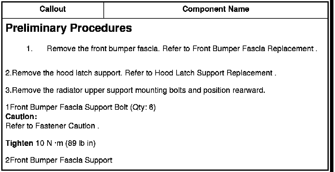 3.Remove the radiator upper support mounting bolts and position rearward.