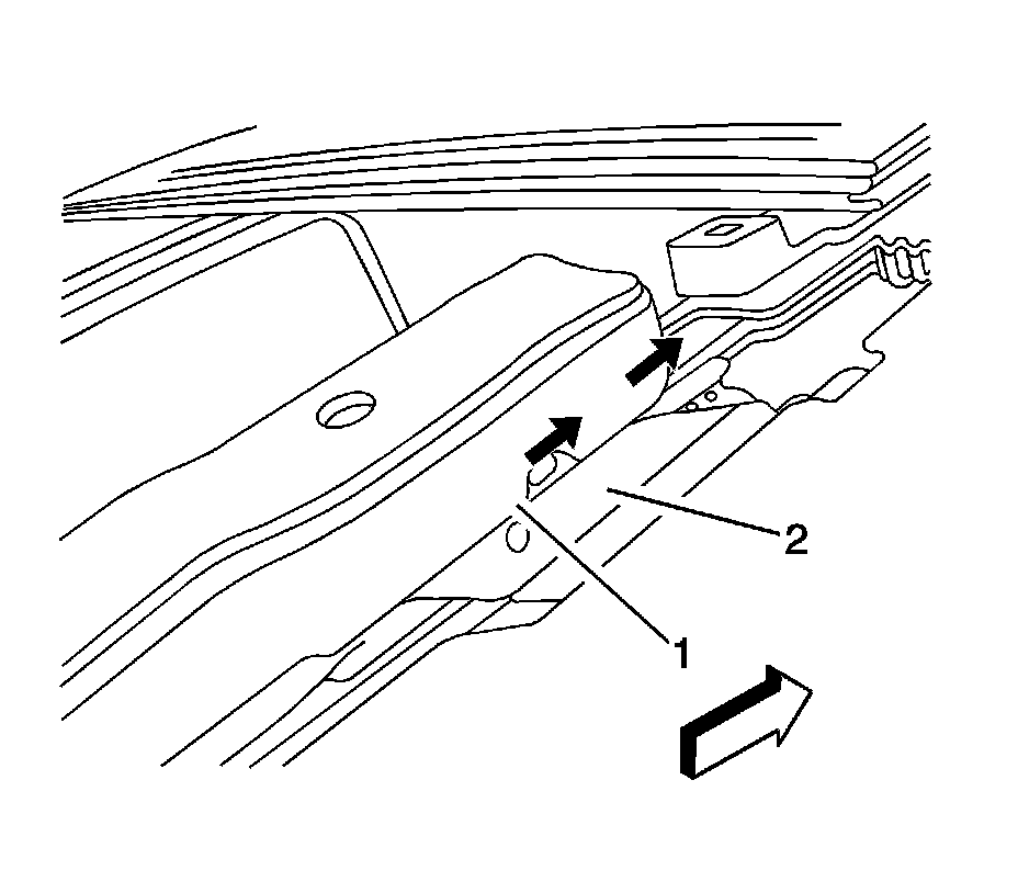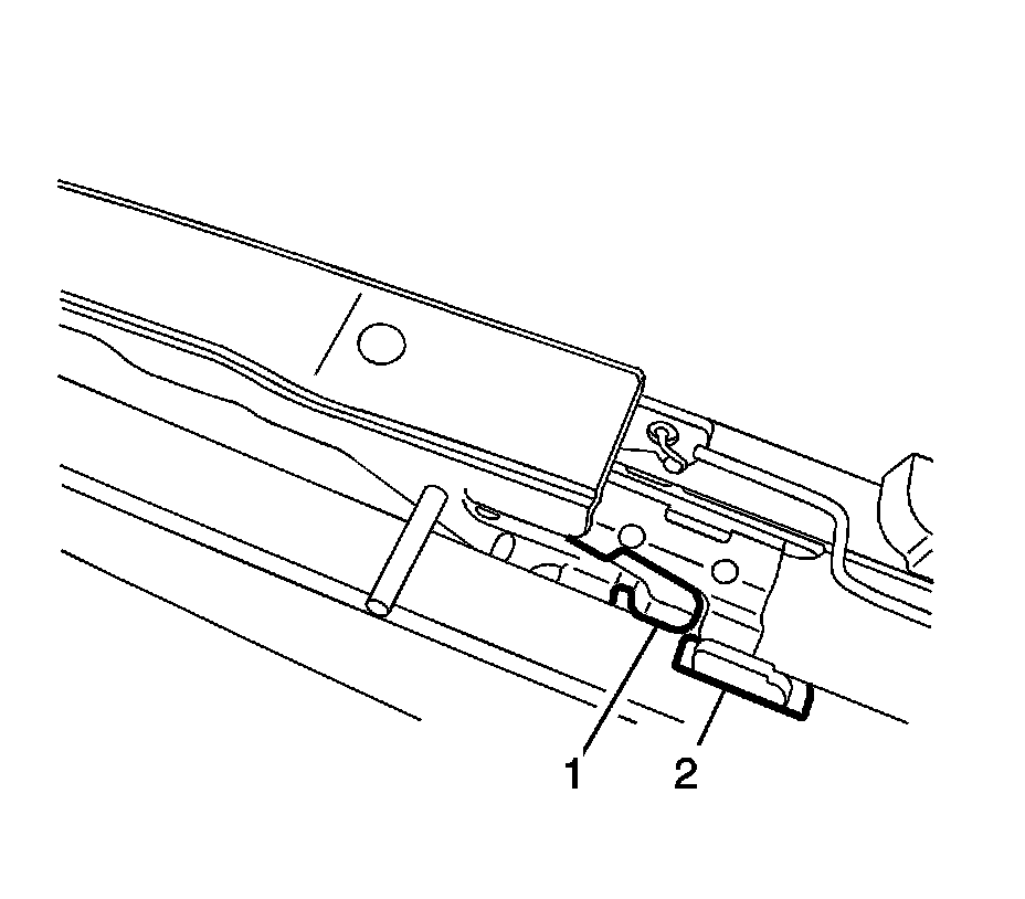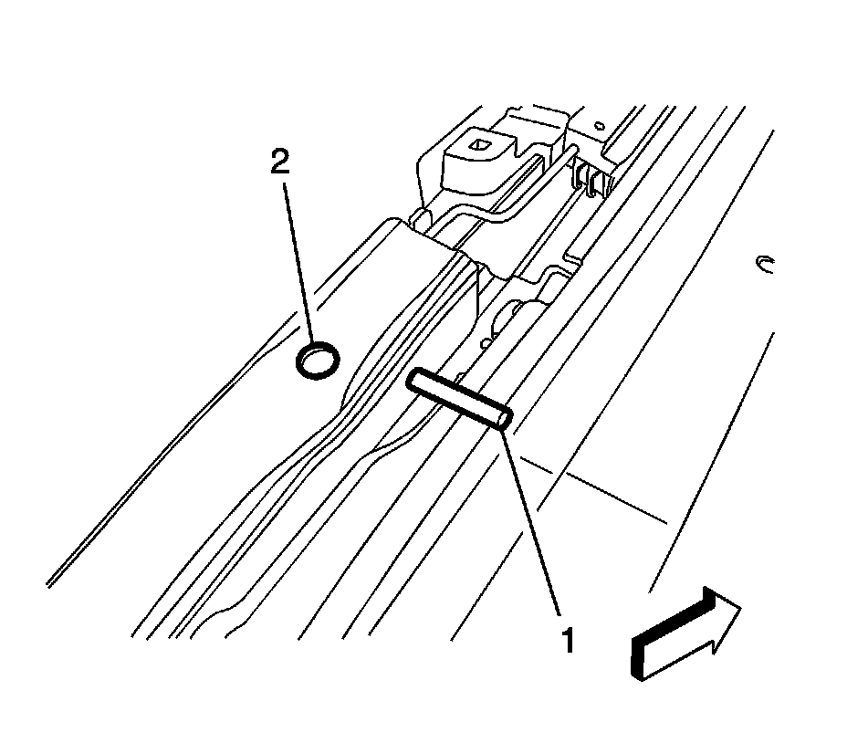3. Remove the dowel pin (1) from the holes (2) on both sides of the sunroof frame that held the cams in position while installing the motor/actuator.