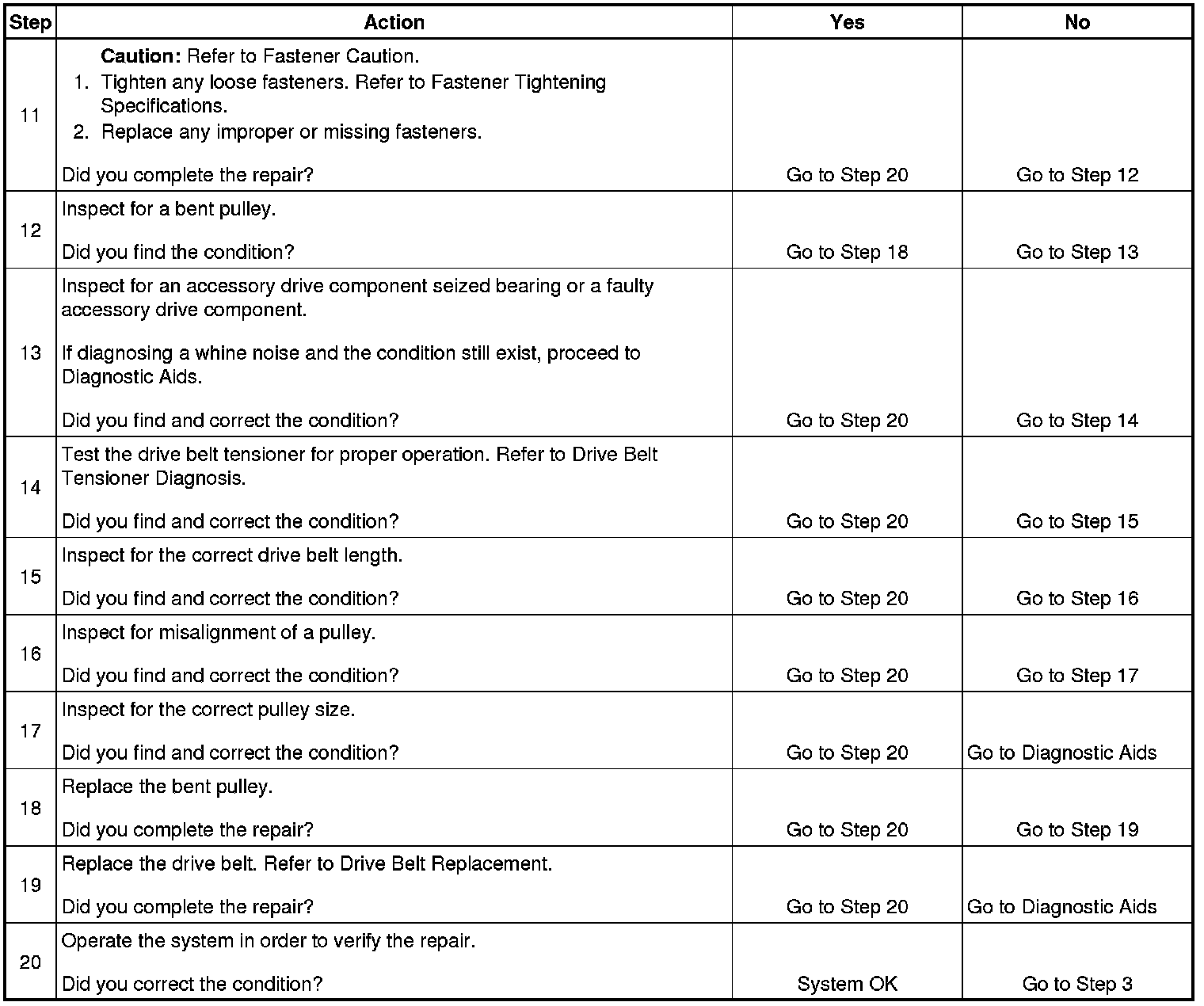* If the noise is intermittent, verify the accessory drive components by varying their loads making sure they are operated to their maximum capacity. An overcharged A/C system, power steering system with a pinched hose or wrong fluid, or a generator failing are suggested items to inspect.
