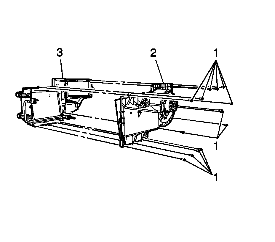 10. Remove the fourteen screws (1) from the evaporator and blower module assembly case.