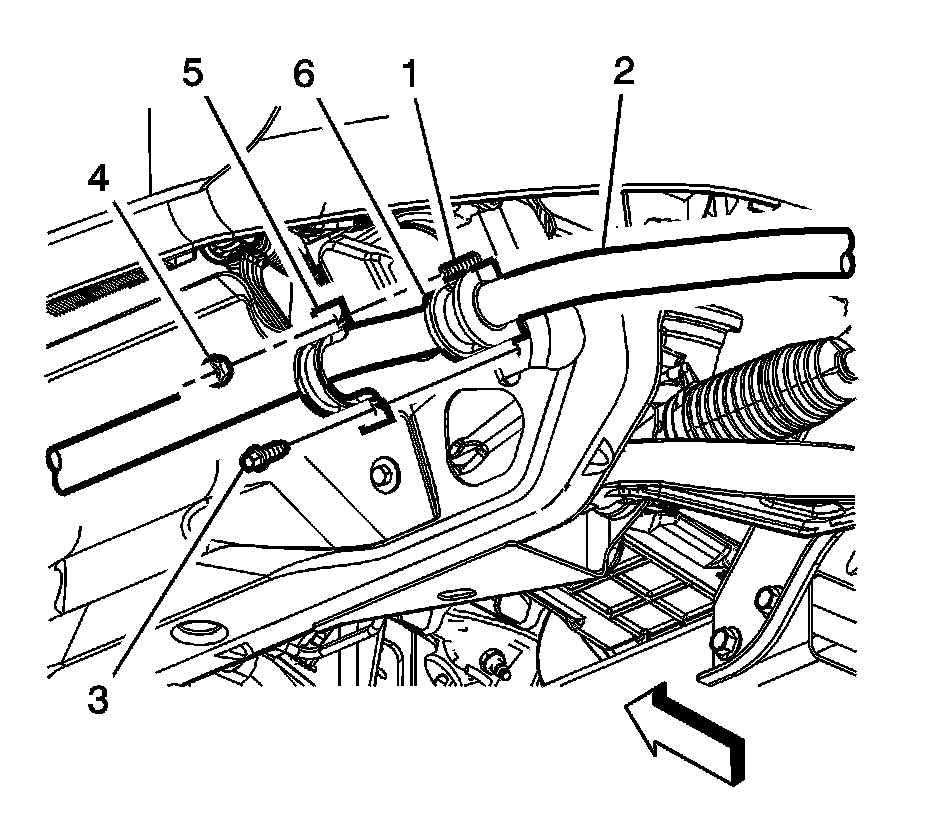 8. Lower the stabilizer shaft (2) and remove the stabilizer shaft insulators (6) (2500 series w/8500 and 8600 GVW and 3500 series).