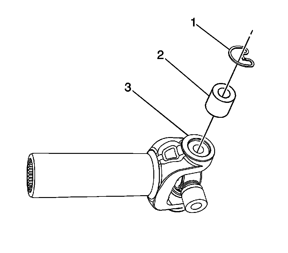 12. Using the J-9522-3 - Separator, J-9522-5 - Remover and a press, remove the universal bearing (2) from the yoke (3).