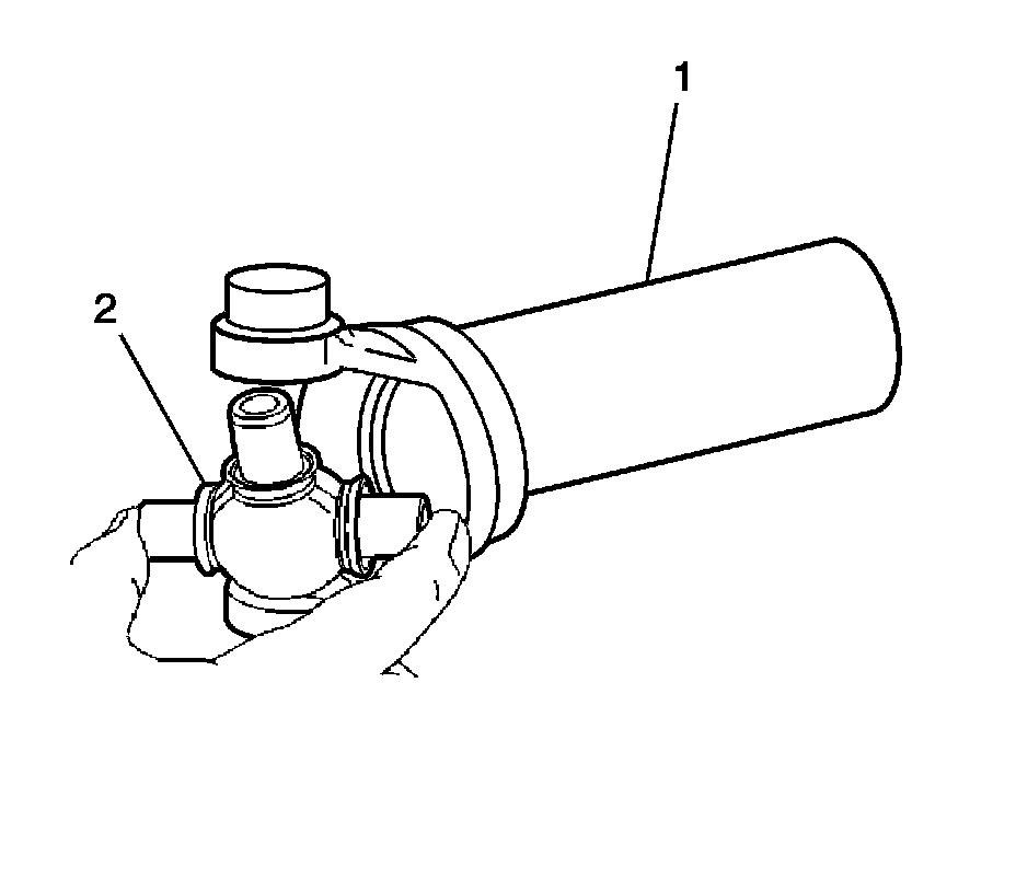 20. Rotate the universal joint to ensure that the universal joint moves freely. If not, use a hammer (2) and lightly tap each of the yokes (1) to seat the universal bearing against the retaining ring.