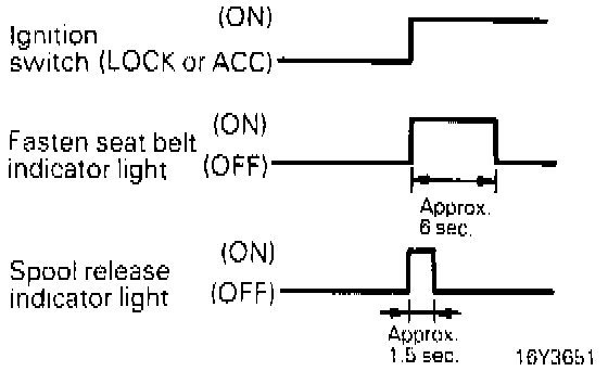 When the ignition switch is turned from LOCK or ACC to ON, the "fasten seat belt" indicator light lights up and stays lit for approximately 6 seconds and spool release indicator light lights up and stays lit for approximately 1.5 seconds. The lights go off if the ignition switch is turned LOCK or ACC during the predetermined period of time.