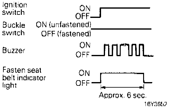 If the lap belt on the driver's seat is not buckled when the ignition switch is turned ON from the LOCK or ACC position, buzzer is activated for approximately 6 seconds. The "fasten seat belt" indicator light, at the same time, lights up and stays lit for the same period of time.