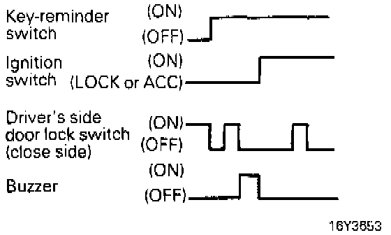 When the door lock switch on the driver's side door is turned LOCK or ACC from ON position (close open), the buzzer will sound without interruption in case the steering lock switch is ON (key inserted in key cylinder) and the ignition switch is in LOCK or ACC position.