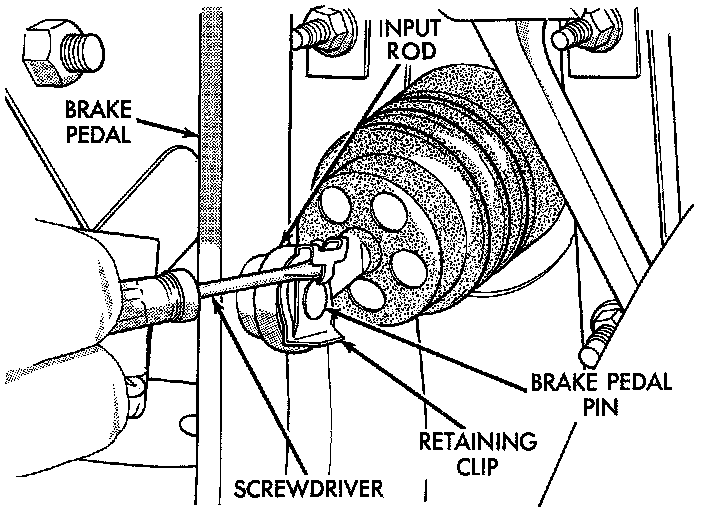 12. Locate the vacuum booster input rod to brake pedal attachment under instrument panel. Position a small screwdriver between the retaining clip center tang and the retaining clip. Rotate screwdriver enough to allow retaining clip center tang to pass over end of brake pedal pin. Then pull retaining clip off brake pedal pin. Discard retaining clip. Replace only with a new retaining clip when assembled.