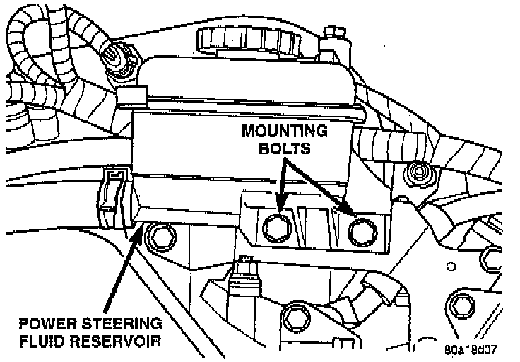 6. Remove bolts attaching power steering fluid reservoir to engine.