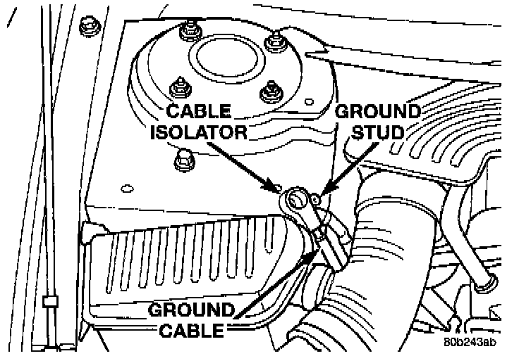1. Remove the remote ground cable from the ground stud on the right strut tower.