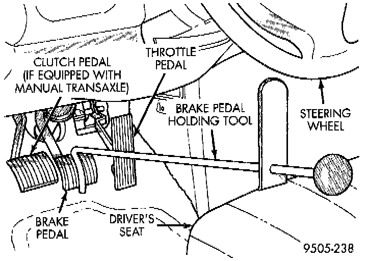 3. Using a brake pedal positioning tool such as shown depress brake pedal past its first 1 inch of travel and hold in this position. This will isolate the master cylinder reservoir from the brake hydraulic system, not allowing the brake fluid to drain out of the reservoir.