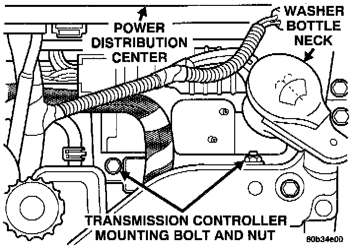 6. Remove the nut and bolt holding the transmission controller and bracket to vehicle. Lift transmission controller up and move away from mounting position.