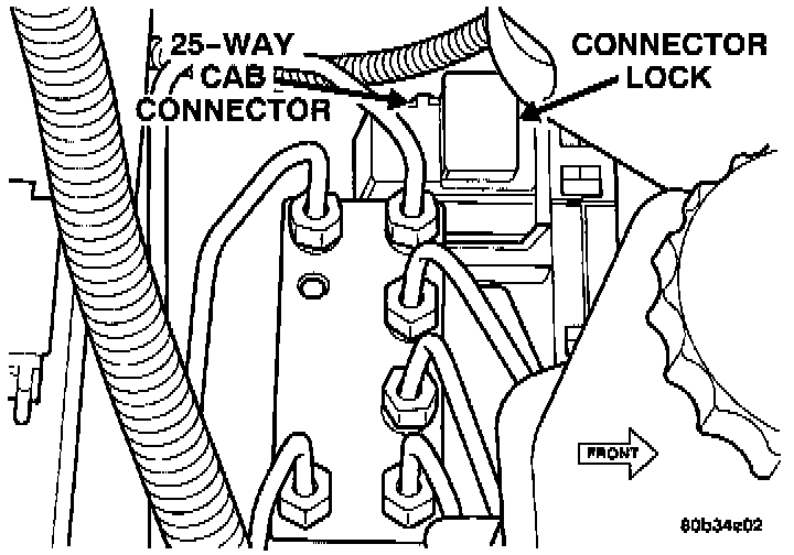 10. Disconnect the 25 way wiring harness connector from the CAB using the following procedure. Grasp the lock on the 25 way connector, and pull it up from the connector as far as possible. This will unlock and raise the 25 way connector out of the socket on the CAB.