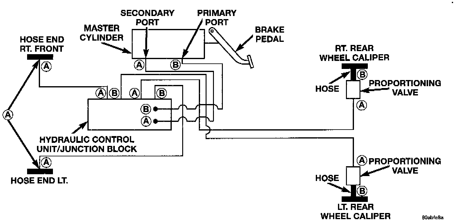 The hydraulic brake system is diagonally split on both the Non-ABS and ABS braking system. With the left front and right rear brakes on one hydraulic system and the right front and left rear on the other.