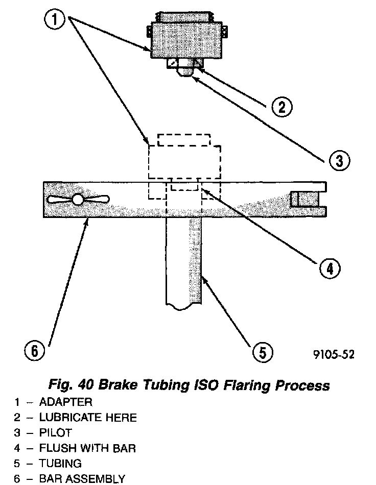 1. Carefully prepare the end of the tubing to be flared. Be sure the end of the tubing is square and all burrs on the inside of the tubing are removed. This preparation is essential to obtain the correct form of a (metric) ISO tubing flare.