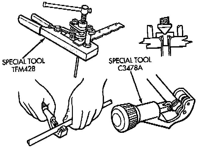 Using Tubing Cutter, Special Tool C-3478-A or equivalent, cut off damaged seat on tubing. Ream out any burrs or rough edges showing on inside of tubing. This will make the ends of tubing square and ensure better seating of flared end tubing. Be sure to put the tube nut on tubing before the tubing is flared.