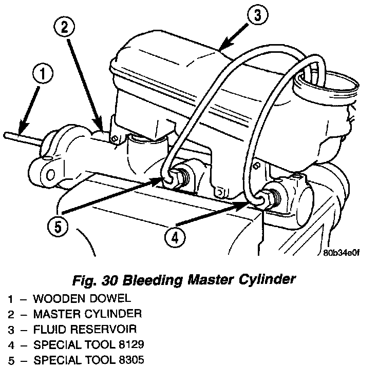 NOTE: The master cylinder on this vehicle uses ISO style flares and metric threads on the master cylinder outlet ports. Special Tool Packages 8129 and 8305 or equivalents have ISO style flares and metric threads on their bleeding tubes.