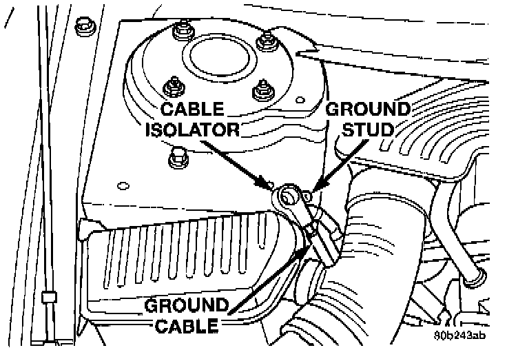 1. Remove the battery ground cable from the ground stud on the right strut tower. Then, correctly isolate the ground cable by installing the cable isolator on the ground stud.