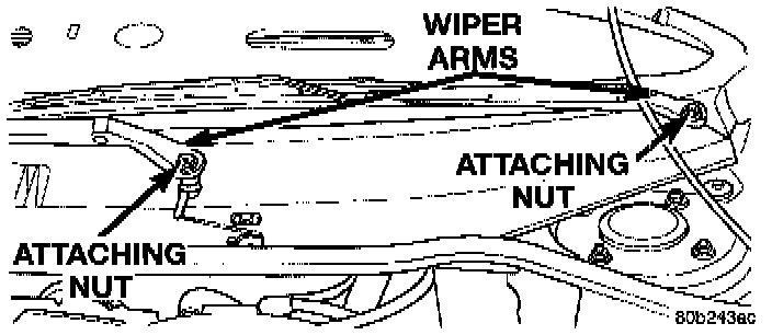 2. Remove caps from both wiper arms at the attachment to the pivots to expose the wiper arm attaching nut. Remove the nut attaching each wiper arm to its pivot.