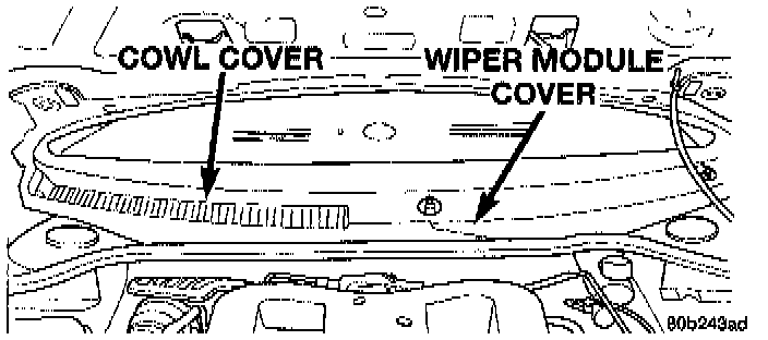 11. Install the covers over the wiper module and the cowl. Install and securely tighten the attaching screws.