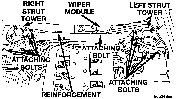 5. Remove the 8 bolts, attaching the reinforcement to the strut towers and the 1 bolt attaching the wiper module to the reinforcement. Remove the reinforcement from the vehicle.