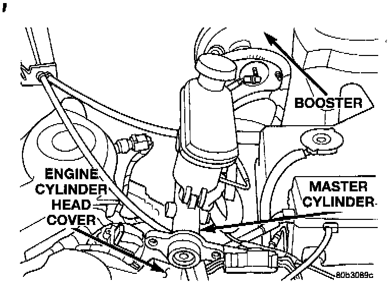 8. Carefully slide master cylinder off vacuum booster with brake lines attached, and position it backwards, on top of left engine cylinder head cover.