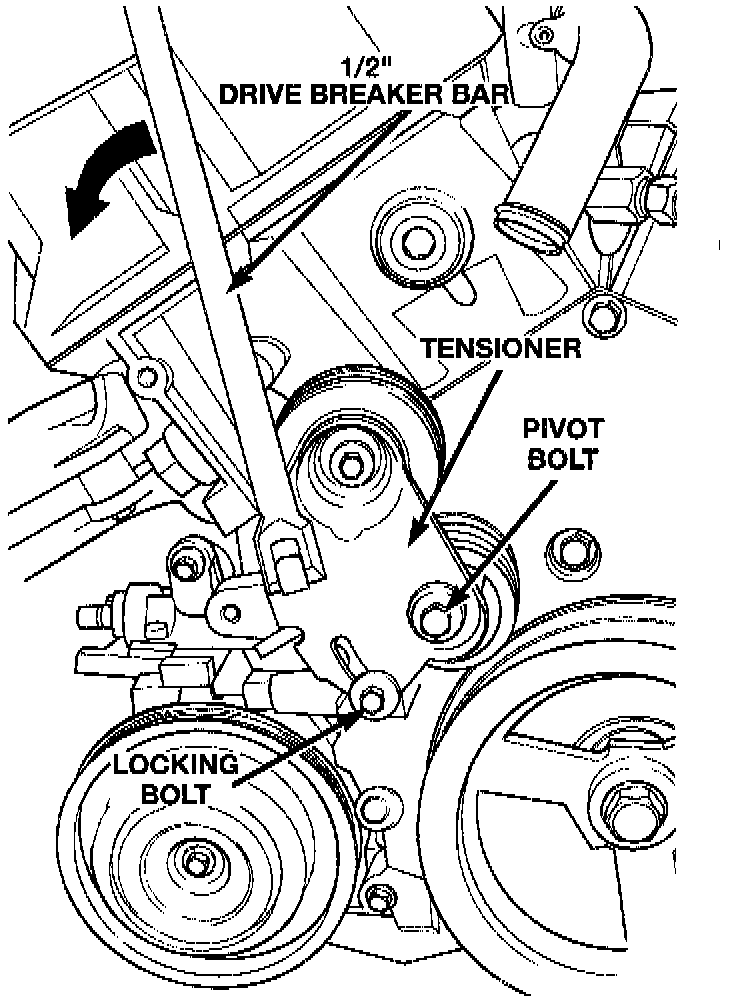 1. Insert a 1/2" drive breaker bar into the square opening on tensioner. Hold counterclockwise pressure on tensioner, while removing tensioner locking bolt.