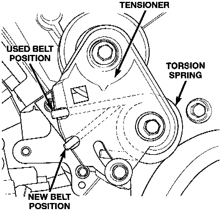 ^ Perform steps 1 - 7 to change the tensioner spring from the NEW belt position, to the USED belt position.