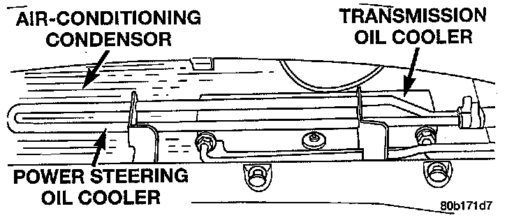 The power steering fluid cooler is located at the front of the vehicle. It is mounted to the radiator lower support just forward of the air-conditioning condenser and just reward the front fascia. The cooler is positioned so it is in the direct air flow through the front fascia of the vehicle.
