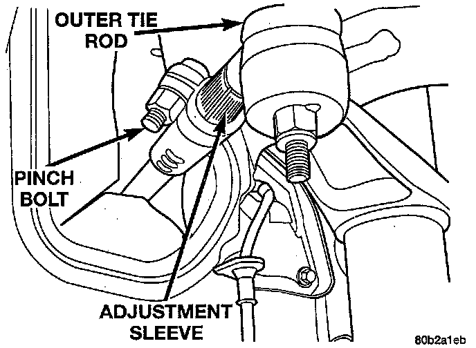 1. Install the outer tie rod into the adjustment sleeve. Do not tighten the adjustment pinch bolt at this time.