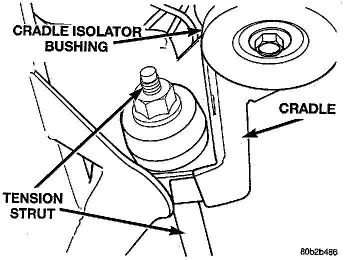 NOTE: To remove tension strut to cradle bushings from vehicle for replacement, the tension strut and lower control arm first MUST be removed as an assembly from the vehicle.REMOVE