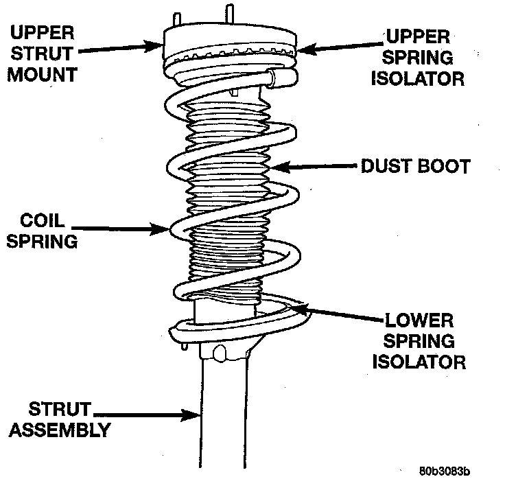 4. Lift dust boot and inspect strut assembly for evidence of fluid running from the upper end of fluid reservoir. (Actual leakage will be a stream of fluid running down the side and dripping off lower end of unit). A slight amount of seepage between the strut rod and strut shaft seal is not unusual and does not affect performance of the strut assembly. Also inspect jounce bumpers inside dust boot for signs of damage or deterioration.