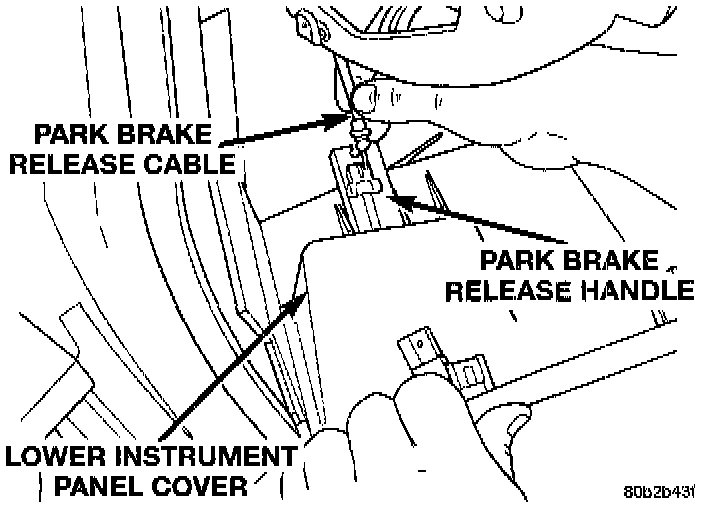 12. Remove the park brake release cable, from the park brake release handle in the lower instrument panel cover.