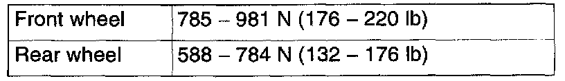 ^ When testing the front brakes, apply the parking brake. When testing the rear brakes, stop the front wheels with chocks.