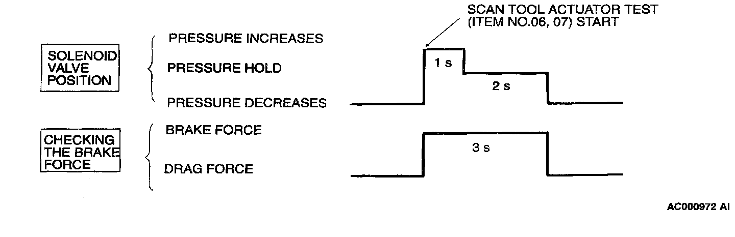 6. Turn the wheel by hand and check the change in braking force. Use a braking force tester. The braking force reading value should change when the actuator test is carried out. The result should be as shown in the diagram above.