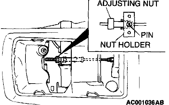 2. If the parking brake lever stroke is not the standard value, adjust as described below. Remove the floor console cup tray or arm rest assembly, loosen the adjusting nut as far as the end of the cable rod to release the cable, and then adjust by the following procedure: