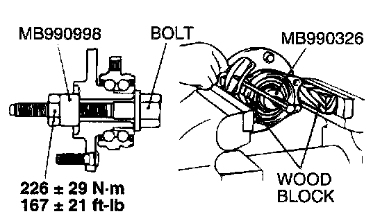 1. Install the special tools MB990998 and MB990326 to the front hub assembly and tighten the nut to the specified torque.