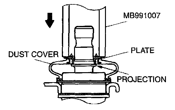 4. Using special tool MB991007, drive in the dust cover plate until it contacts the projection of the ball joint.