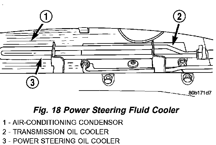 All models of this vehicle are equipped with a cooler for the power steering system fluid. The power steering fluid cooler is located at the front of the vehicle. It is mounted to the radiator lower support just forward of the air-conditioning condenser and just rearward of the front fascia. The cooler is positioned so it is in the air flow through the front fascia of the vehicle.