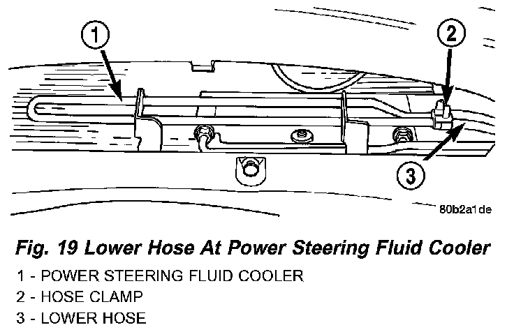 4. Remove the hose clamp from the lower hose at the power steering fluid cooler. Remove the lower hose from the power steering fluid cooler. Drain remaining power steering fluid from the hoses and the power steering fluid cooler.